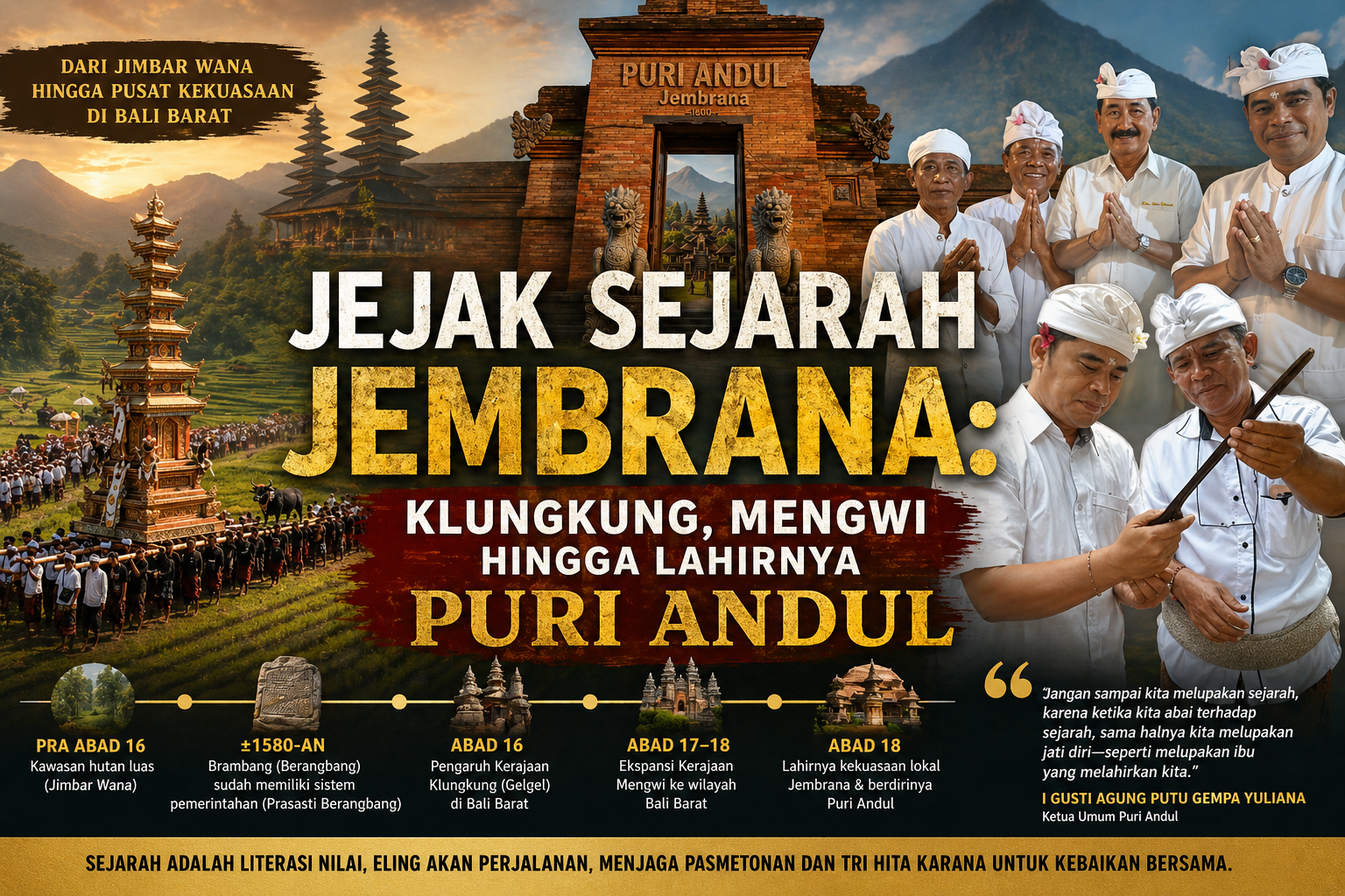 Menelusuri perjalanan sejarah Kabupaten Jembrana Bali dari kawasan “Jimbar Wana” yang lebat, dalam pengaruh Klungkung dan Mengwi, hingga berkembang menjadi pusat kekuasaan lokal yang ditandai dengan lahirnya Puri Andul sebagai simbol pemerintahan, budaya, dan warisan nilai bagi generasi muda Bali.