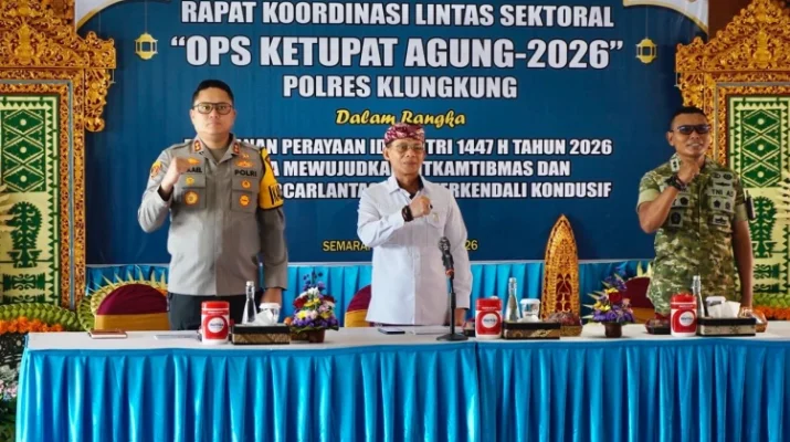 KLUNGKUNG – Menghadapi momentum perayaan dua hari besar keagamaan yang jatuh dalam waktu berdekatan, Bupati Klungkung, I Made Satria, menghadiri Rapat Koordinasi (Rakor) Lintas Sektoral dalam rangka “Operasi Ketupat Agung Tahun 2026”. Pertemuan strategis ini berlangsung di Aula Jalaga Dharma Pandhapa, Polres Klungkung, Jumat (6/3).